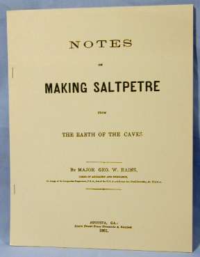 by Angelo I. George. This is a 1986 reprint from The Filson Club History Quarterly, vol. 60, no. 2, p. 189-217. Discusses the effect of the War of 1812 on the geographic distribution of 133 caves and 6 rock shelters mined for saltpeter and 22 gunpowder factories in Kentucky. Shows that existing roads prior to 1818 were more important saltpeter and gunpowder sighting criteria than any other socio-geographic-geologic presence. Notes on Making Saltpetre $3.50 by Major George W. Rains; Steam Power Press Chronicle and Sentinel, Augusta, Georgia, 1883, 10 pages. Facsimile reprint of the classic Confederate States of America cook-book on domestic saltpeter making. The reprint is for edification only. An element of caution is needed, because there are certain inherent life threatening dangers associated with the manufacture of saltpeter and its more powerful relative, gunpowder.