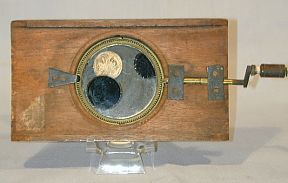 Item #6013. Shows full and partial eclipse of the moon as viewed from the earth. The magic lantern has a mahogany frame, brass gear crank attached to a single circular brass rack work mechanical assembly and, hand painted glass slides. Paper descriptive tags are in most part removed from the unit. The mechanical astronomical slide is similar to those made by Carpenter and Wesley, England. Dimensions are: 6 7/8 inch long, 3 7/8 inch high with a 2 ½ inch diameter viewing area. In overall good working condition.